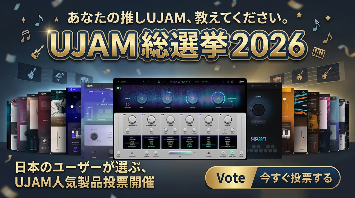 あなたの「推しUJAM製品」に投票しよう!投票していただいた方の中から抽選で 20名様にUJAM SELECT 5 Bundleをプレゼント!あなたの1票がUJAM人気No.1製品を決めます。
