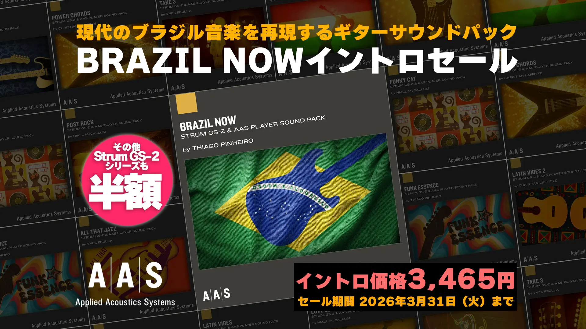 A|A|Sの人気ギター音源Strum GS-2に、新たなサウンドパック「Brazil Now」が登場。リリースを記念して、期間限定のイントロセールを開催します。セール期間中はStrum GS-2が50%オフ。さらに新作サウンドパック「Brazil Now」が無料で付属します。またGS-2専用サウンドパックも50%オフでお求めいただけます。