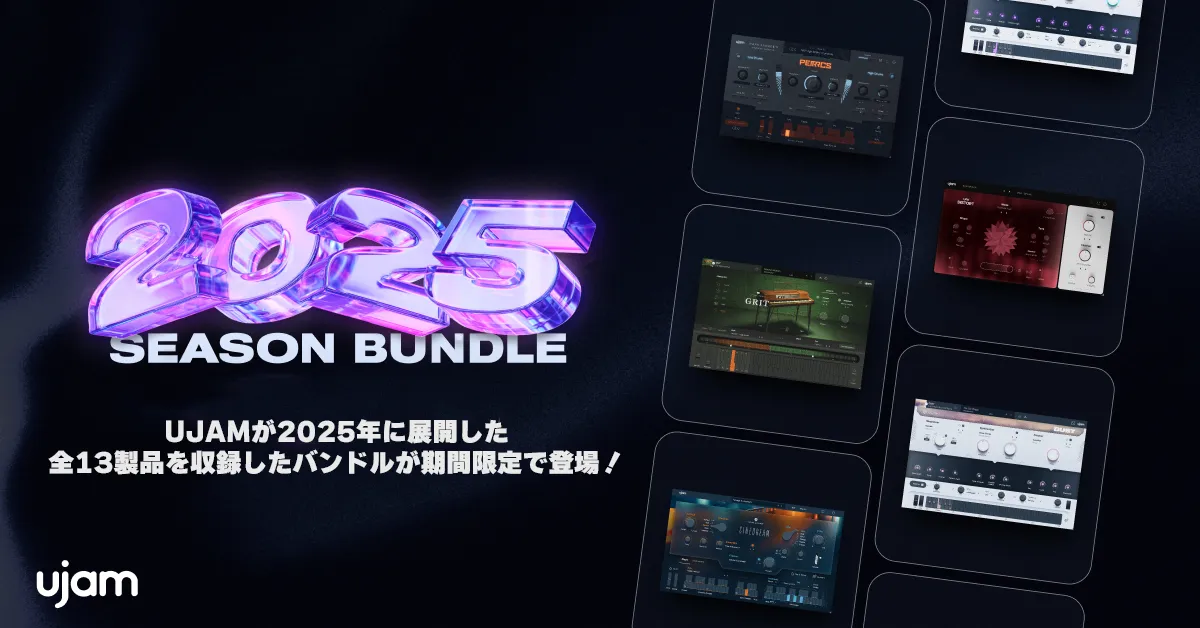 UJAMが2025年にリリースした全13製品を収録した期間限定バンドルが登場!エフェクト、シンセ、ベース、ギター、ビート、パーカッション、ピアノまで、現代の音楽制作に必要な要素を網羅的にカバーしており、ジャンルや制作スタイルを問わず、あらゆるクリエイターの即戦力として活躍します!