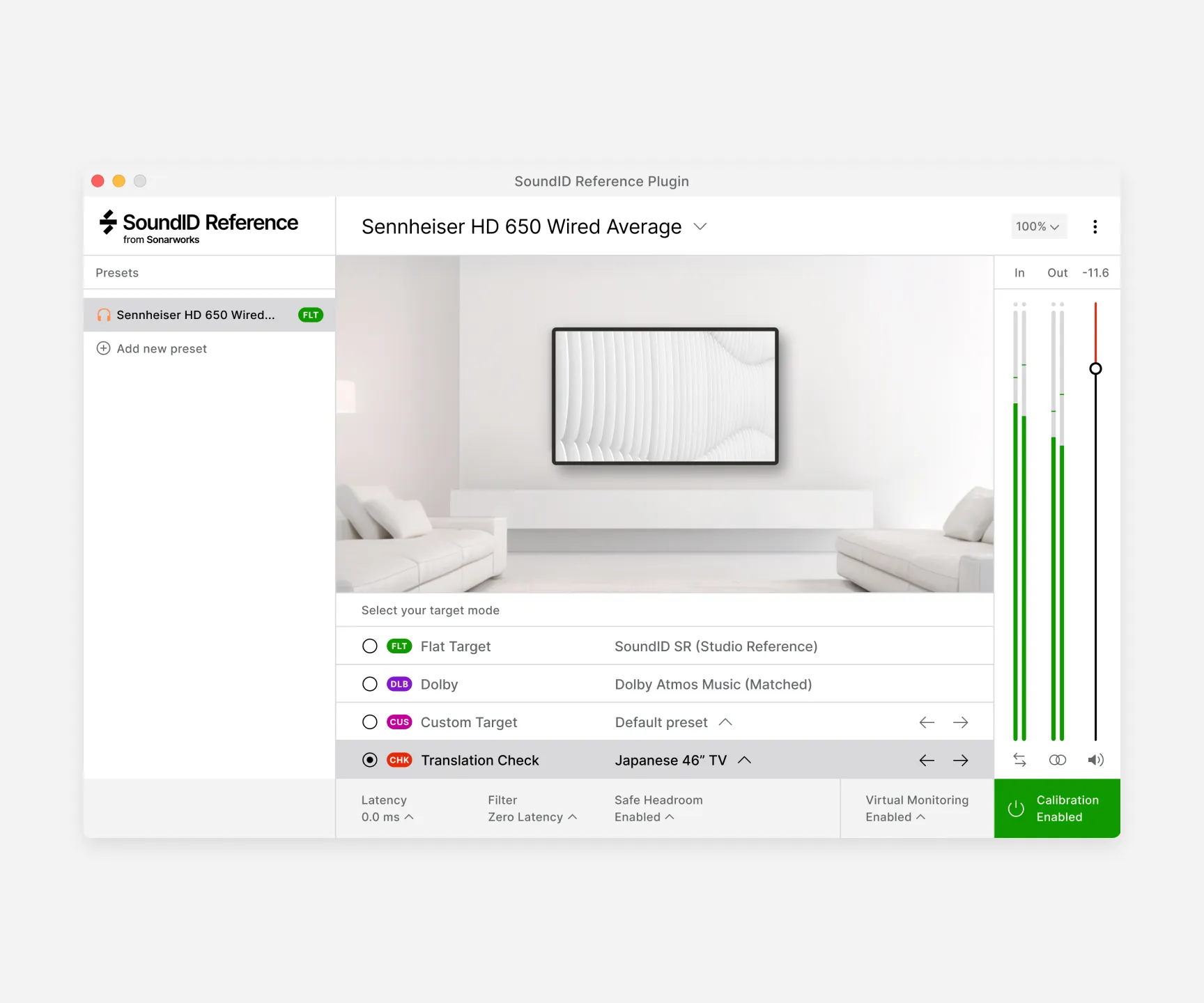 SoundID Reference Virtual Monitoringは、仮想スタジオモニターシミュレーションおよび環境間の違いをチェックする為のエミュレーション用のプリセットライブラリを提供します。