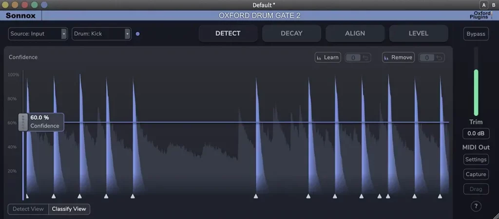 Drum Gate 2 はドラムヒット検出を大幅に進化させ、多様な演奏スタイル・録音環境において Kick / Snare / Tom / Hi-Hat を極めて高精度に検出します。