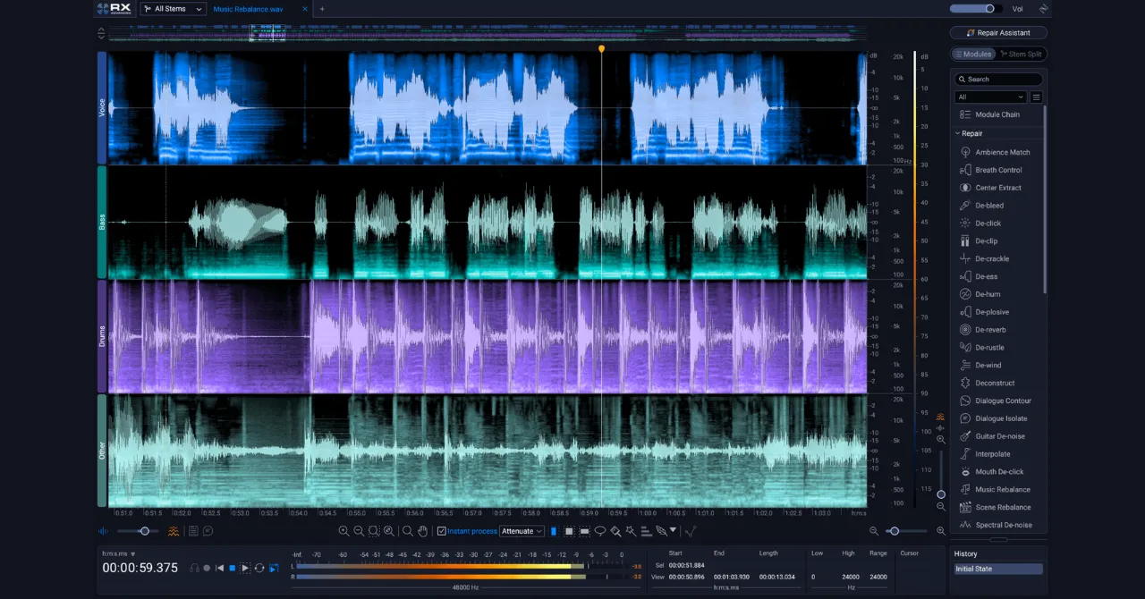 [Improved]ノートパソコンでも精密な編集が可能なスペクトログラムの拡大、スクロールを減らすモジュール検索、サイズ変更可能な履歴パネルにより作業の軌跡を簡単に追跡できます。デザインを一新し、RXの使いやすさがさらに向上しました。