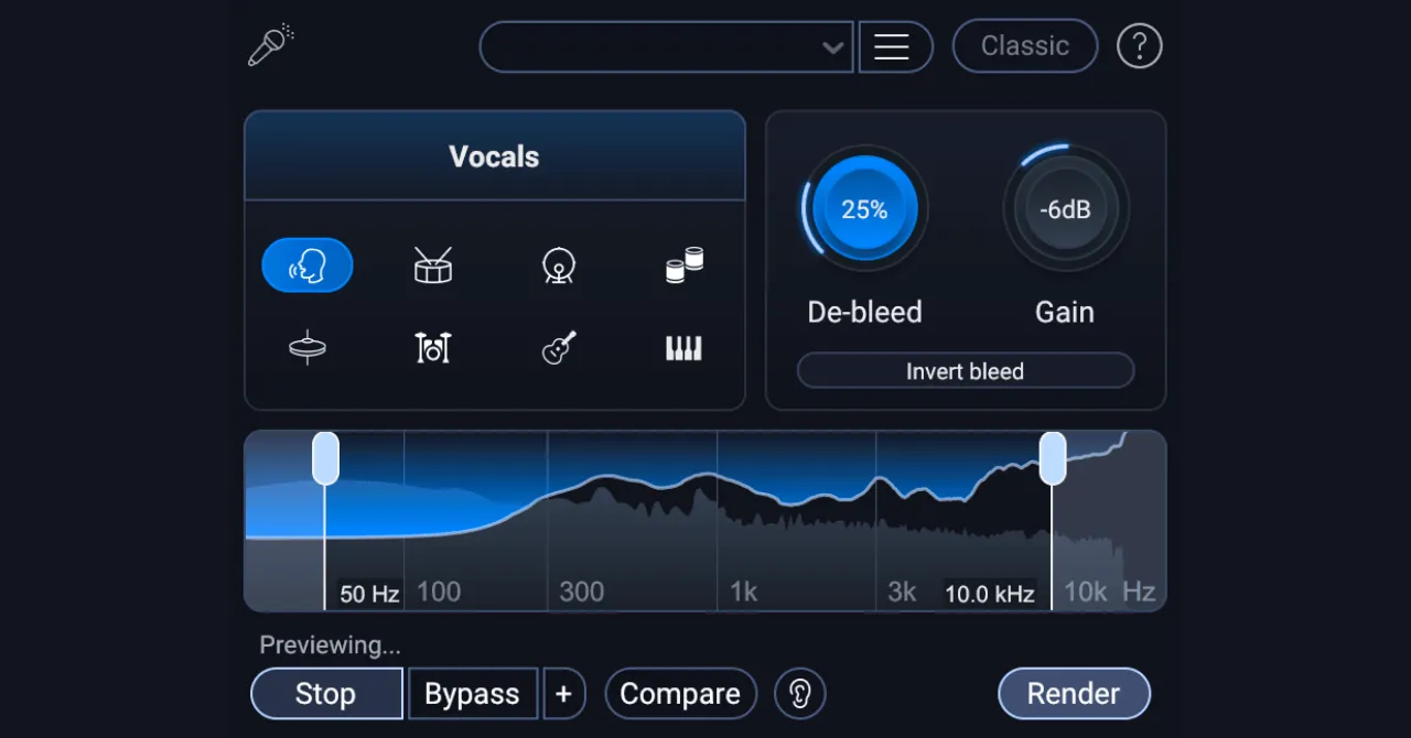 [Rebuilt]信号間の干渉を低減します。最先端の機械学習を用いて再構築され、ドラム全体からスネア、タム、シンバルなどパート単位の分離、さらにボーカル、ギターやピアノにもアクセス、より高い精度と優れた結果を実現します。参照用に「bleed(混入元の信号)」トラックをアップロードする必要もなくなりました。
