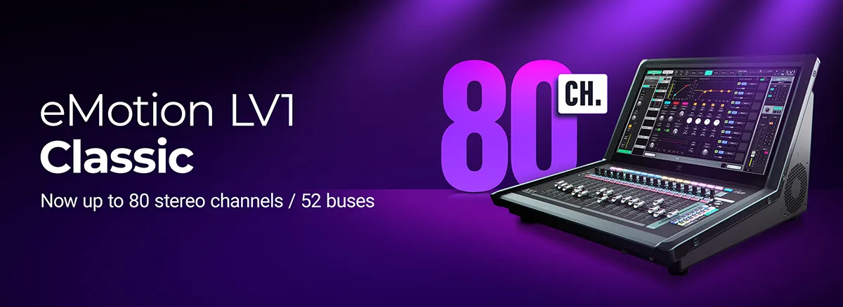 eMotion LV1 80-Channel Expansion は、Waves LV1 Classic または LV1 64-Channel ライセンスを、最大 80ステレオチャンネル(=160インプット)/52バス へ拡張できるソフトウェアオプションです。