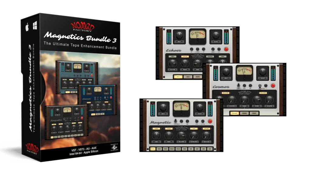 バンドルには、トラックやミックス全体に倍音の深みを加える多才なテープ・ウォーマーMagnetic、音楽的なディレイとヴィンテージなモジュレーションを提供するアナログ・テープ・エコーEchoes、そして低域を豊かにしクリアな存在感を加えるハーモニック・エキサイターCosmosが含まれています。これらは現代の制作において、プロフェッショナルでヴィンテージなサウンドを実現するための不可欠なリソースとなります。