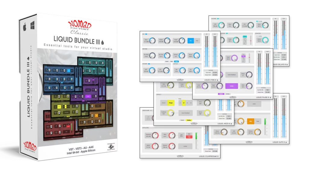 このバンドルには、スムーズで音楽的なダイナミクス制御を実現するLiquid Compressor、ドラムをタイトにし不要なノイズを低減するLiquid Gate、奥行きを与える豊かなテープ・スタイルのLiquid Delaysが含まれています。また、コーラスやフランジャーで動きを加えるLiquid Mod、繊細またはドラマチックなフェイジング効果のLiquid Phase、そして空間と暖かみを作り出すヴィンテージ・リバーブLiquid Verbがセットを完結させます。