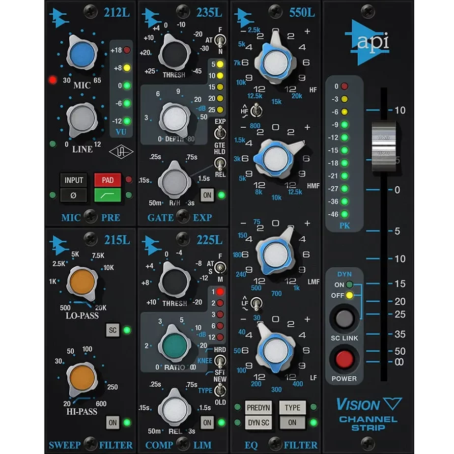 API Vision Channel Strip Collection は、Unison マイクプリアンプ技術により、Apollo インターフェイスでさらに優れた機能を発揮します。Unison は、ソフトウェアと Apollo のマイクプリアンプ間の双方向制御と通信により、API の象徴的な 212L プリアンプの重要なインピーダンス、ゲインステージの「スイートスポット」、回路動作をすべて提供します。さらに、マイク/ラインスイッチ、専用カットフィルター、-6 dB ラインパッドなど、API の主力製品である Vision Console と同じ機能も利用できます。