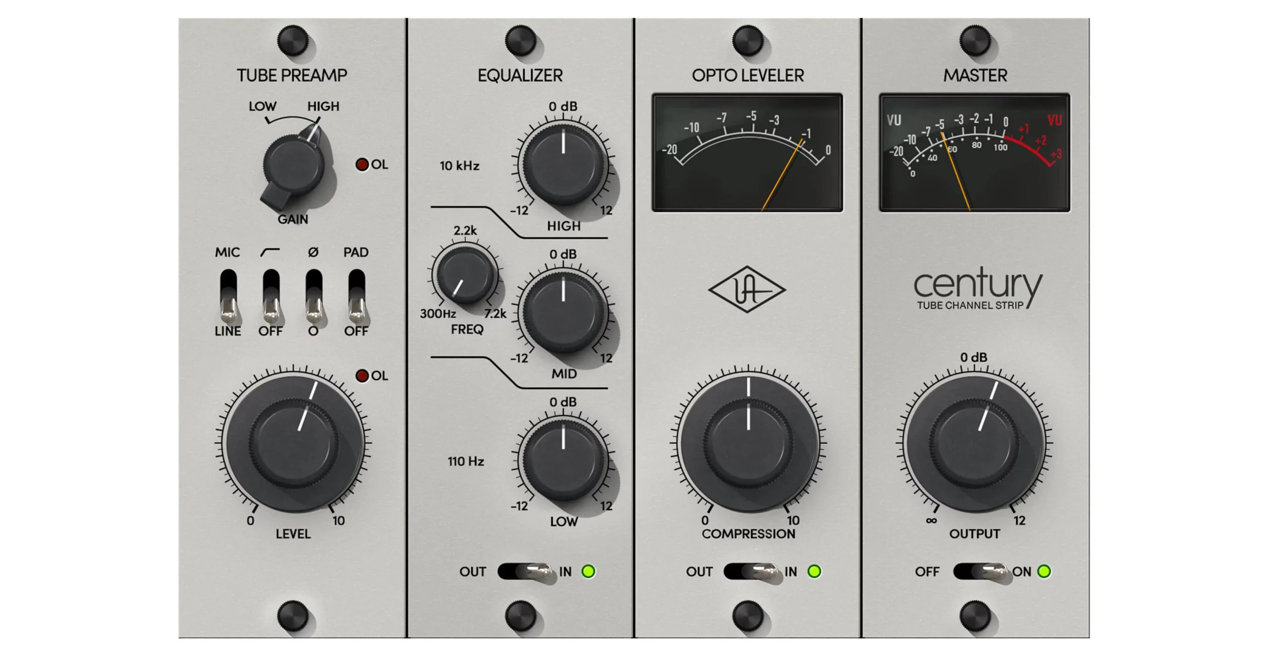 Century Tube Channel Stripは、直感的で音楽的な音色を持つ3バンドEQで、ブレスの長いボーカルのディテールを素早く引き出したり、オーバードライブしたエレキギターにパンチを加えたり、アコースティックリズムギターに推進力のあるシズル感や輝きを与えるのに最適です。
