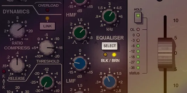 SSL 4000 E Channel Strip Collectionプラグインは、Type E 242の「ブラックノブ」と001の「ブラウンノブ」の4バンドEQとフィルターを備えています。「ブラウン」のEQは操作しやすく音楽的ですが、「ブラック」はよりサージカルでクリーンです。どちらもアイコニックなSSLバンド間干渉とアンプモデリングを提供し、ドラムにパンチを効かせ、ボーカルに存在感を、ベースに重みを加えます。