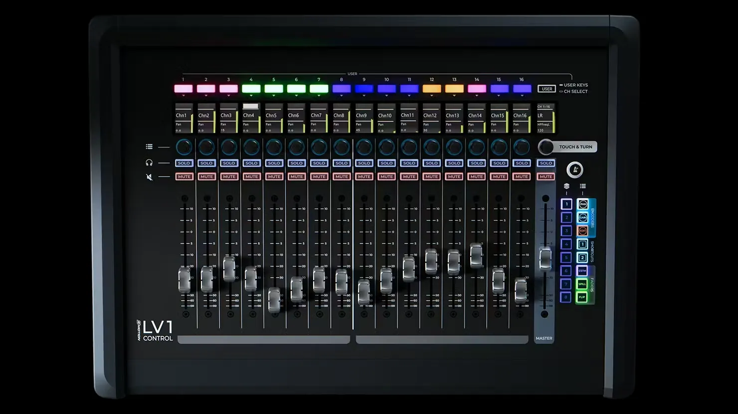 eMotion LV1 Classicの操作パネルと同じ構成を採用したeMotion LV1 Controlは、17個のモーター駆動100mmフェーダー、17個のエンコーダー、チャンネルごとのメーターを備えた17個のLCDミニディスプレイを搭載。